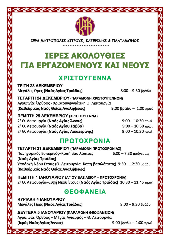 Με ιδιαίτερη ποιμαντική μέριμνα και ενδιαφέρον προς τους εργαζόμενους και τους νέους, η Ιερά Μητρόπολη Κίτρους, Κατερίνης και Πλαταμώνος ανακοινώνει ότι κατά την εορταστική περίοδο των Χριστουγέννων, της Πρωτοχρονιάς και των Θεοφανείων θα τελεστούν ειδικές ιερές ακολουθίες, προσαρμοσμένες στις ανάγκες όσων δυσκολεύονται να συμμετάσχουν στο καθιερωμένο λατρευτικό πρόγραμμα.