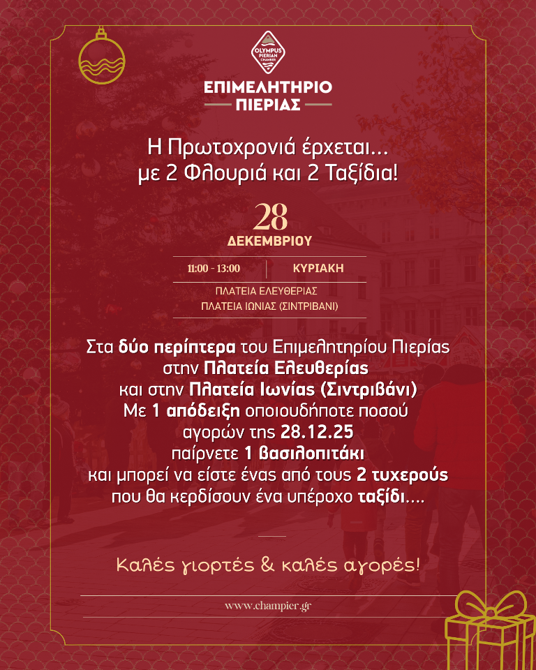 Το Επιμελητήριο Πιερίας διοργανώνει εορταστική δράση, την Κυριακή 28 Δεκεμβρίου 2025, από τις 11:00 έως τις 15:00, στον κεντρικό πεζόδρομο της οδού Μ. Αλεξάνδρου στην Κατερίνη.
