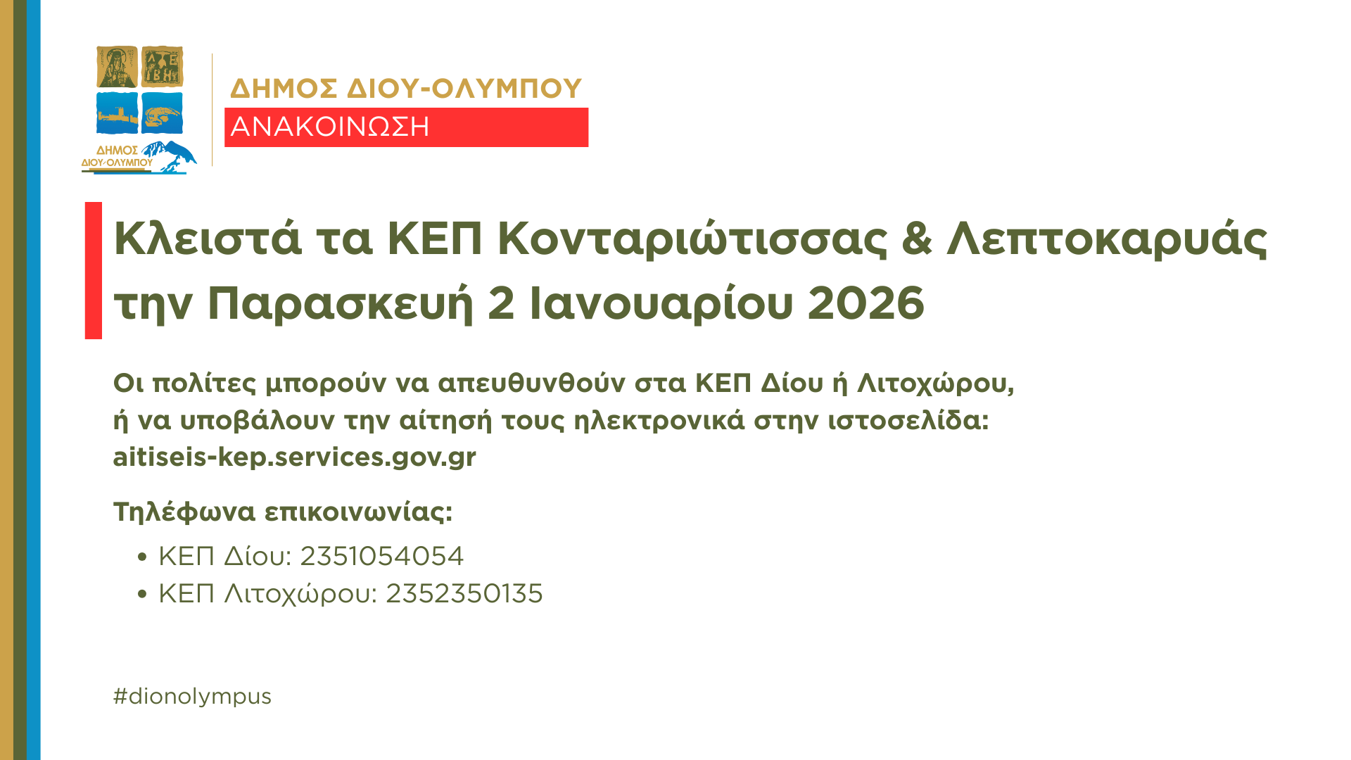 Κλειστά θα παραμείνουν τα ΚΕΠ Κονταριώτισσας και Λεπτοκαρυάς την Παρασκευή 2 Ιανουαρίου 2026.