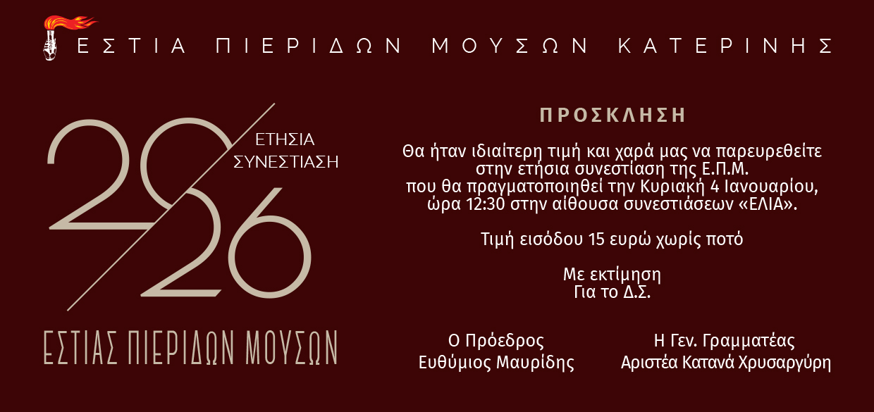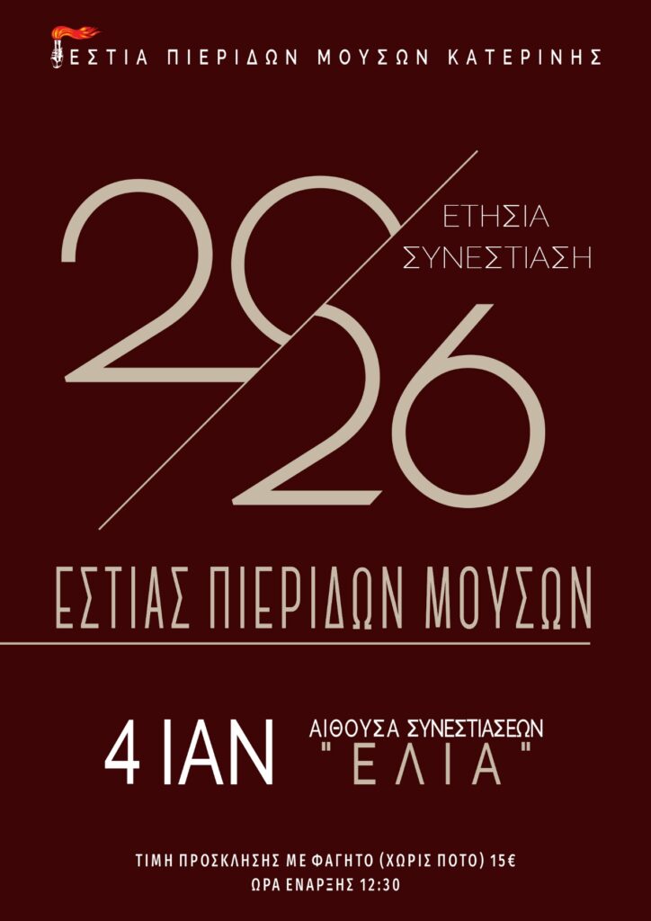 Ετήσια συνεστίαση -κοπή βασιλόπιτας της Ε.Π.Μ. – Κυριακή, 4/1 στις 12:30 Ψυχαγωγία 3 Ιανουαρίου 20263 Ιανουαρίου 2026Pieria Social