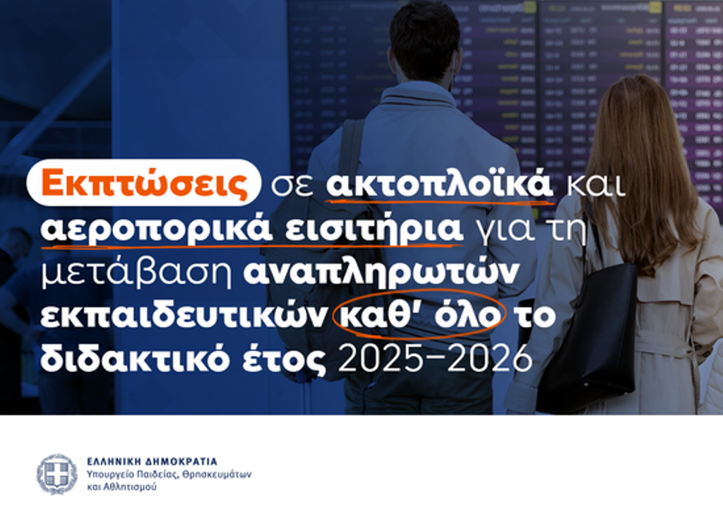 Με πρωτοβουλία της Υπουργού Παιδείας, Θρησκευμάτων και Αθλητισμού, Σοφίας Ζαχαράκη και του Υπουργού Ναυτιλίας και Νησιωτικής Πολιτικής, Βασίλη Κικίλια, παρέχονται εκπτώσεις στις τιμές των εισιτηρίων προς τους αναπληρωτές εκπαιδευτικούς, με στόχο την έγκαιρη μετάβασή τους στον τόπο υπηρεσίας τους, σε κάθε φάση πρόσληψης και καθ’ όλη τη διάρκεια του τρέχοντος σχολικού έτους.