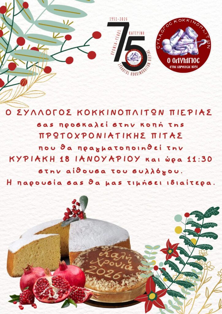 Ο Σύλλογος Κοκκινοπλιτών Ν. Πιερίας ”Ο Όλυμπος” σας προσκαλεί στην ετήσια εκδήλωση κοπής της βασιλόπιτας, η οποία θα πραγματοποιηθεί την Κυριακή 18 Ιανουαρίου 2026 και ώρα 11:30π.μ., στην Πολιτιστική Στέγη του Συλλόγου, επί της οδού Νίκης 12.