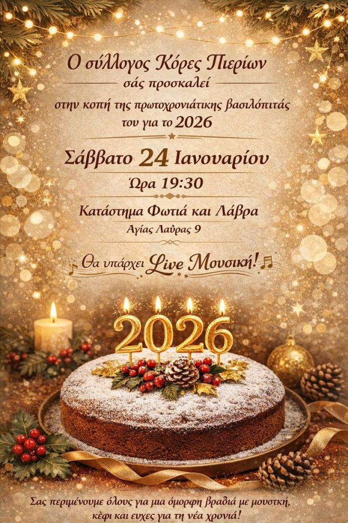 Το Διοικητικό Συμβούλιο του Συλλόγου Κόρες Πιερίων σας προσκαλεί με χαρά στην κοπή της βασιλόπιτας, η οποία θα πραγματοποιηθεί στο κατάστημα «Φωτιά και Λάβρα», Αγίας Λαύρας 9, με ζωντανό μουσικό πρόγραμμα για μια όμορφη βραδιά.