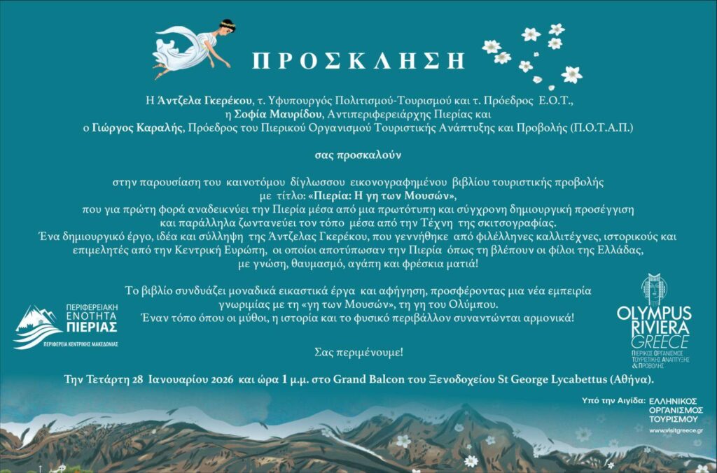 Την Τετάρτη 28 Ιανουαρίου 2026, στο «Grand Balcon» του ξενοδοχείου «St. George Lycabettus», θα πραγματοποιηθεί η επίσημη παρουσίαση του δίγλωσσου εικονογραφημένου βιβλίου «Πιερία, Η Γη των Μουσών».
