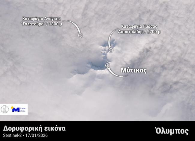 Παρόμοιες καιρικές συνθήκες επικράτησαν και το Σάββατο 17/01, όταν ο δορυφόρος Sentinel-2 είδε τις χιονισμένες κορυφές του Ολύμπου πάνω από τις νεφώσεις.