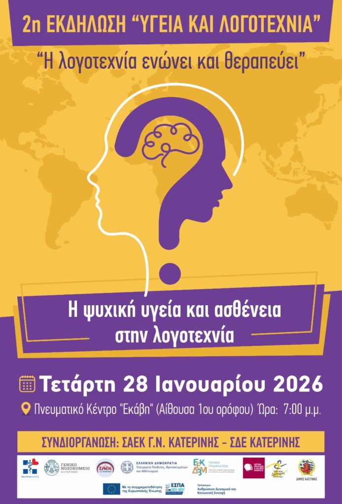 Η ΣΑΕΚ Γ.Ν.Κατερίνης, διοργανώνει στο Πνευματικό Κέντρο του δήμου Κατερίνης στην Εκάβη (αίθουσα ορόφου)την ΤΕΤΑΡΤΗ 28 -1-2026 και ώρες 7μμ-8.30μμ, μαζί με το ΣΔΕ Κατερίνης, τη 2η εκδήλωση «Υγεία και Λογοτεχνία» με θέμα «Ψυχική υγεία και ασθένεια στη λογοτεχνία».