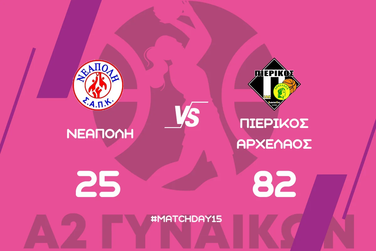 Ο Πιερικός Αρχέλαος επικράτησε με 25-82 της Νεάπολης στο Εθνικό Αθλητικό Κέντρο Νεάπολης σε αγώνα για τη 15η αγωνιστική του 2ου ομίλου της Α2 Εθνικής Κατηγορίας Γυναικών.