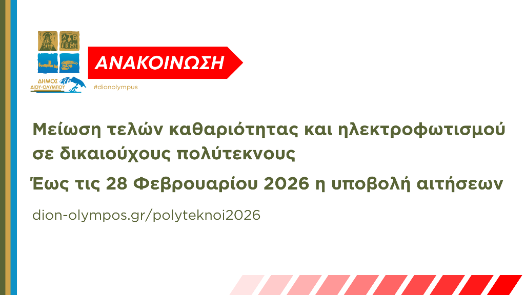 Έως τις 28 Φεβρουαρίου 2026 μπορούν οι δικαιούχοι πολύτεκνοι με προστατευόμενα τέκνα να υποβάλουν αίτηση, για μείωση των δημοτικών τελών καθαριότητας και ηλεκτροφωτισμού της κύριας κατοικίας τους σε ποσοστό 50%.