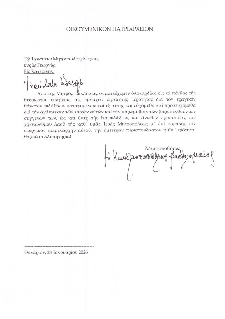 Παράλληλα, μεταφέρει τις πατριαρχικές του ευχές και δεήσεις προς τον Σεβασμιώτατο και την τοπική Εκκλησία, ώστε ο Κύριος να χαρίζει δύναμη και κουράγιο σε όλους όσοι δοκιμάζονται από την ανείπωτη αυτή τραγωδία.