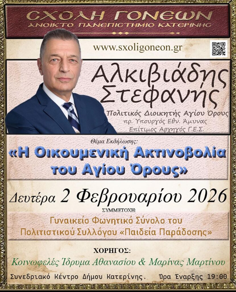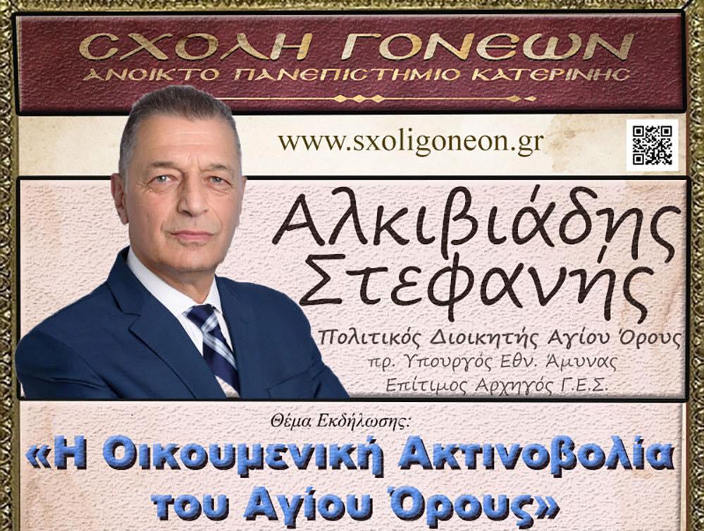 «H Οικουμενική Ακτινοβολία του Αγίου Όρους» είναι το θέμα της εισήγησης του Πολιτικού Διοικητού του Αγίου Όρους, Επίτιμου Α.Γ.Ε.Σ. και πρώην Υπουργού Εθνικής Άμυνας κ. Αλκιβιάδη Στεφανή την Δευτέρα 2 Φεβρουαρίου 2026. Η εκδήλωση πραγματοποιείται σε Συνδιοργάνωση με το Κοινωφελές Ίδρυμα Αθανασίου & Μαρίνας Μαρτίνου.