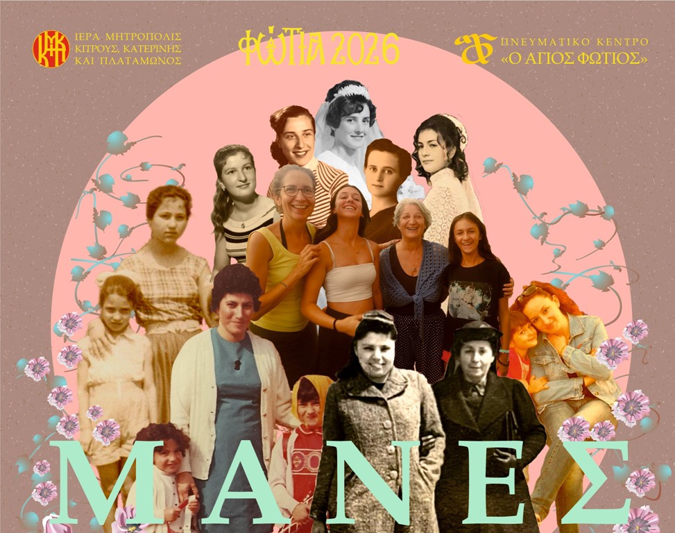 Στο πλαίσιο των «Φωτίων 2026», η Ιερά Μητρόπολη Κίτρους, Κατερίνης και Πλαταμώνος, με τη μέριμνα και την ευλογία του Σεβασμιωτάτου Μητροπολίτου κ. Γεωργίου, διοργανώνει την έκθεση φωτογραφικών συνθέσεων με τίτλο «Μάνες», η οποία θα φιλοξενηθεί στο Πνευματικό Κέντρο της Ιεράς Μητροπόλεως «Ο Άγιος Φώτιος» στην Κατερίνη, από 5 έως 22 Φεβρουαρίου 2026.