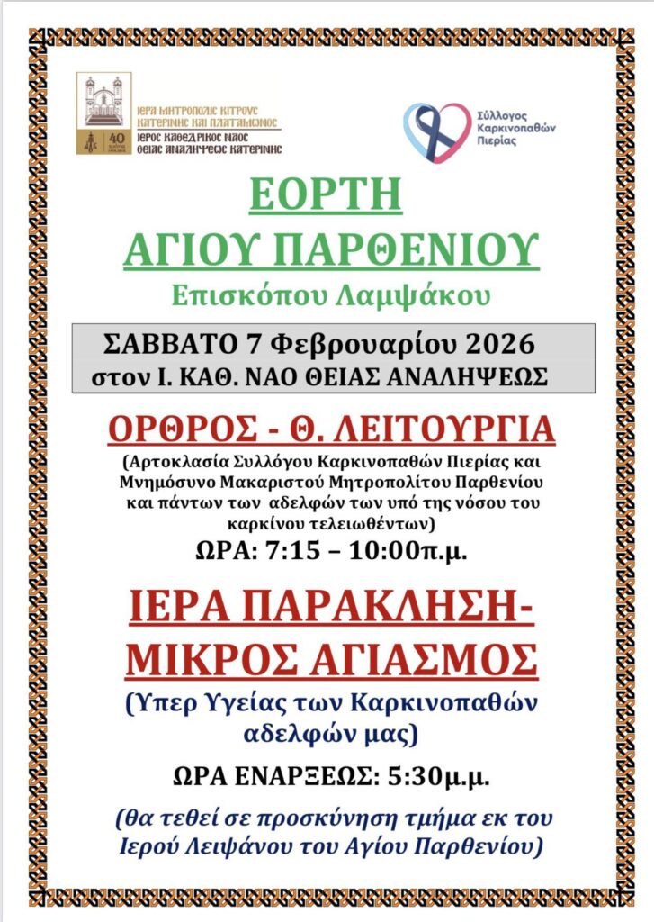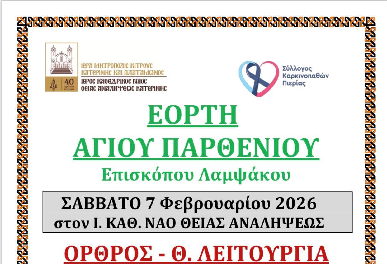 Ο Σύλλογος Καρκινοπαθών Κατερίνης-Πιερίας το Σάββατο 7 Φεβρουαρίου 2026, ώρα 07:15 – 10:00 μ.μ. ημέρα εορτής του Αγίου Παρθενίου, Προστάτη των καρκινοπαθών, θα πραγματοποιήσει, όπως κάθε χρόνο, την τελετή της Θείας Λειτουργίας υπέρ υγείας των ασθενών, εθελοντών και φίλων του συλλόγου όπως και το μνημόσυνο υπέρ αναπαύσεως των κεκοιμημένων καρκινοπαθών στον Ιερό Ναό Θείας Αναλήψεως.
