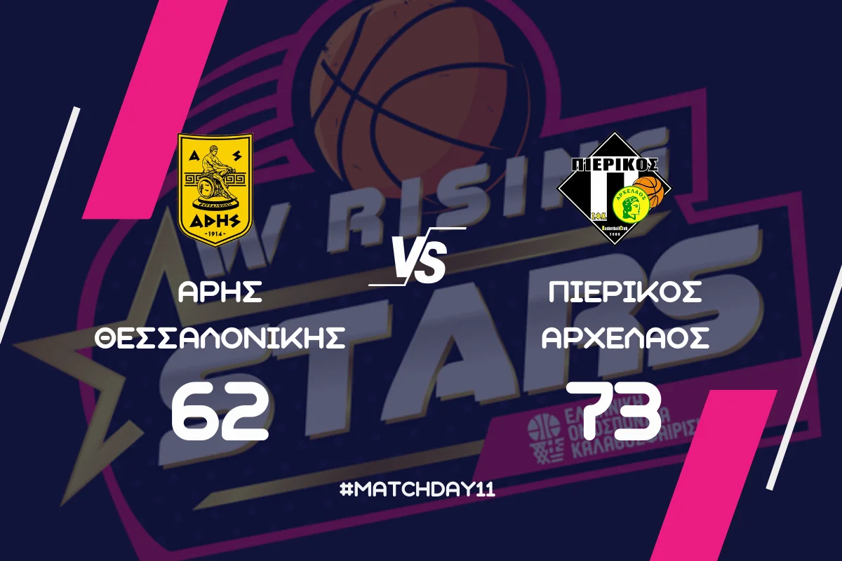 Ο Πιερικός Αρχέλαος επικράτησε με 73-62 του Άρη Θεσσαλονίκης, στο Κλειστό Γυμναστήριο Γέφυρας, σε αγώνα για την 11η και τελευταία αγωνιστική του W Rising Stars.