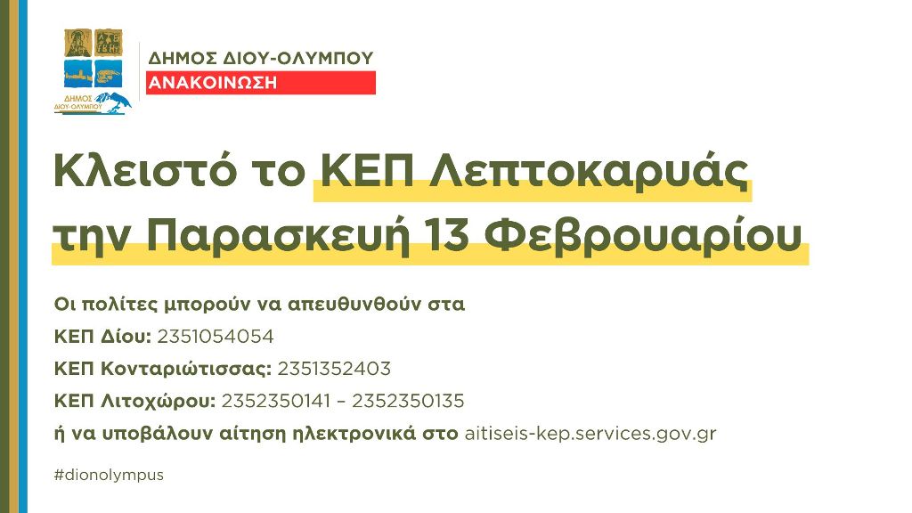 Κλειστό θα παραμείνει το ΚΕΠ Λεπτοκαρυάς την Παρασκευή 13 Φεβρουαρίου 2026.