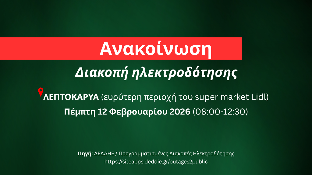 Σύμφωνα με ενημέρωση από τον ΔΕΔΔΗΕ την Πέμπτη 12 Φεβρουαρίου 2026 και ώρες 08:00-12:30 θα πραγματοποιηθεί προγραμματισμένη διακοπή ηλεκτροδότησης στην Λεπτοκαρυά (ευρύτερη περιοχή του super market Lidl).