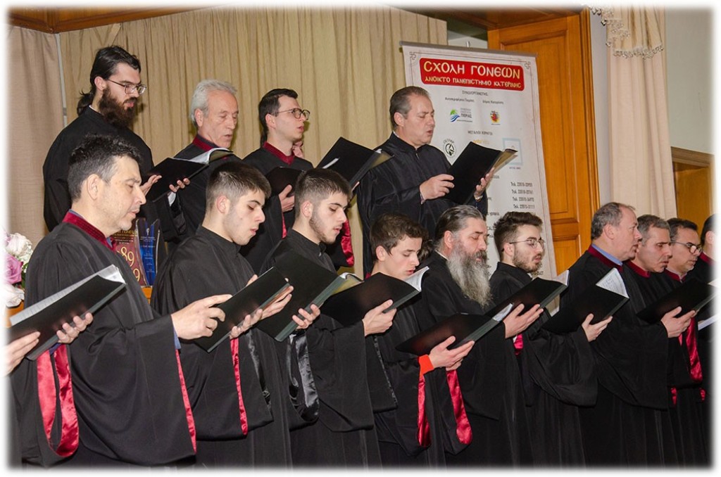 Στην έναρξη της εκδήλωσης ακούστηκαν χορωδιακοί Ύμνοι που ενθουσίασαν το κοινό για την άρτια εκτέλεση τους από την Χορωδία της Γ.Ε.Χ.Α. Κατερίνης «Βυζαντινοί Μελωδοί» υπό την διεύθυνση του πρωτοπρεσβύτερου π. Αθανασίου Μαρινόπουλου.