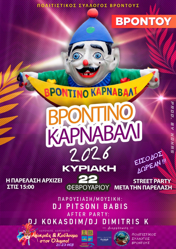 Ο Δήμος Δίου-Ολύμπου σας προσκαλεί στις εορταστικές εκδηλώσεις Αποκριάς και Καθαράς Δευτέρας (20-23 Φεβρουαρίου 2026), γεμάτες μουσική, χορούς και τραγούδια για μικρούς & μεγάλους και δωρεάν είσοδο.