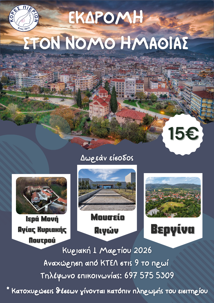 Ο Σύλλογος Κόρες Πιερίων σας προσκαλεί να ξεφύγουμε μαζί σε μια υπέροχη μονοήμερη εκδρομή στον νομό Ημαθίας, γεμάτη πίστη, ιστορία και όμορφες στιγμές!