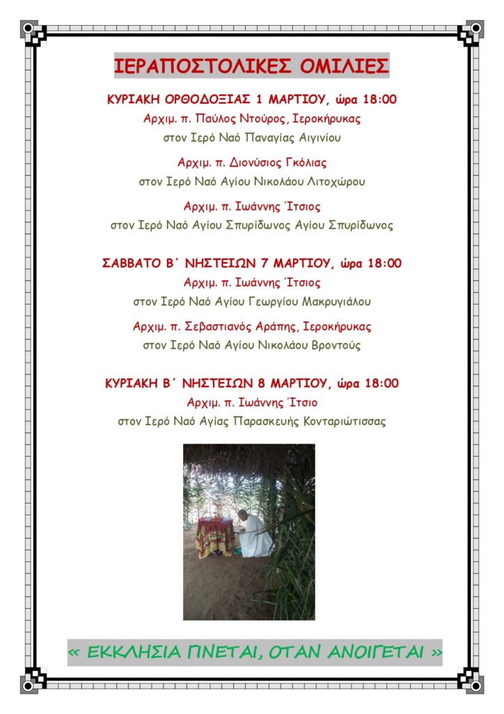 - Ιεραποστολικές ομιλίες σε Ιερούς Ναούς της Ι. Μητροπόλεως από προσκεκλημένους ιεροκήρυκες.
