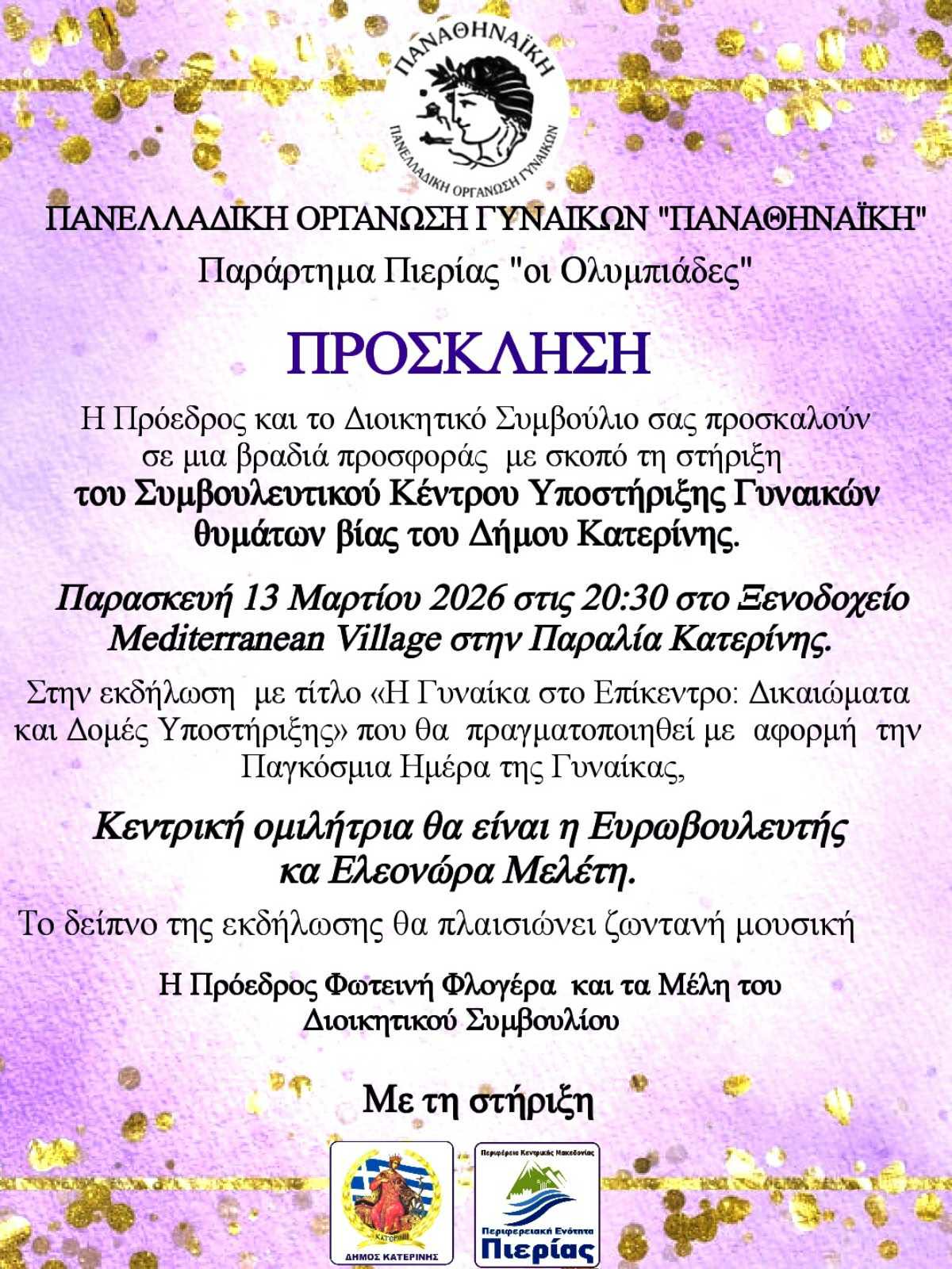 Η εκδήλωση με τίτλο «Η Γυναίκα στο Επίκεντρο: Δικαιώματα και Δομές Υποστήριξης»θα πραγματοποιηθεί με αφορμή την Παγκόσμια Ημέρα της Γυναίκας, την Παρασκευή 13 Μαρτίου 2026 στις 20:30 στο Ξενοδοχείο Mediterranean Village στην Παραλία Κατερίνης.