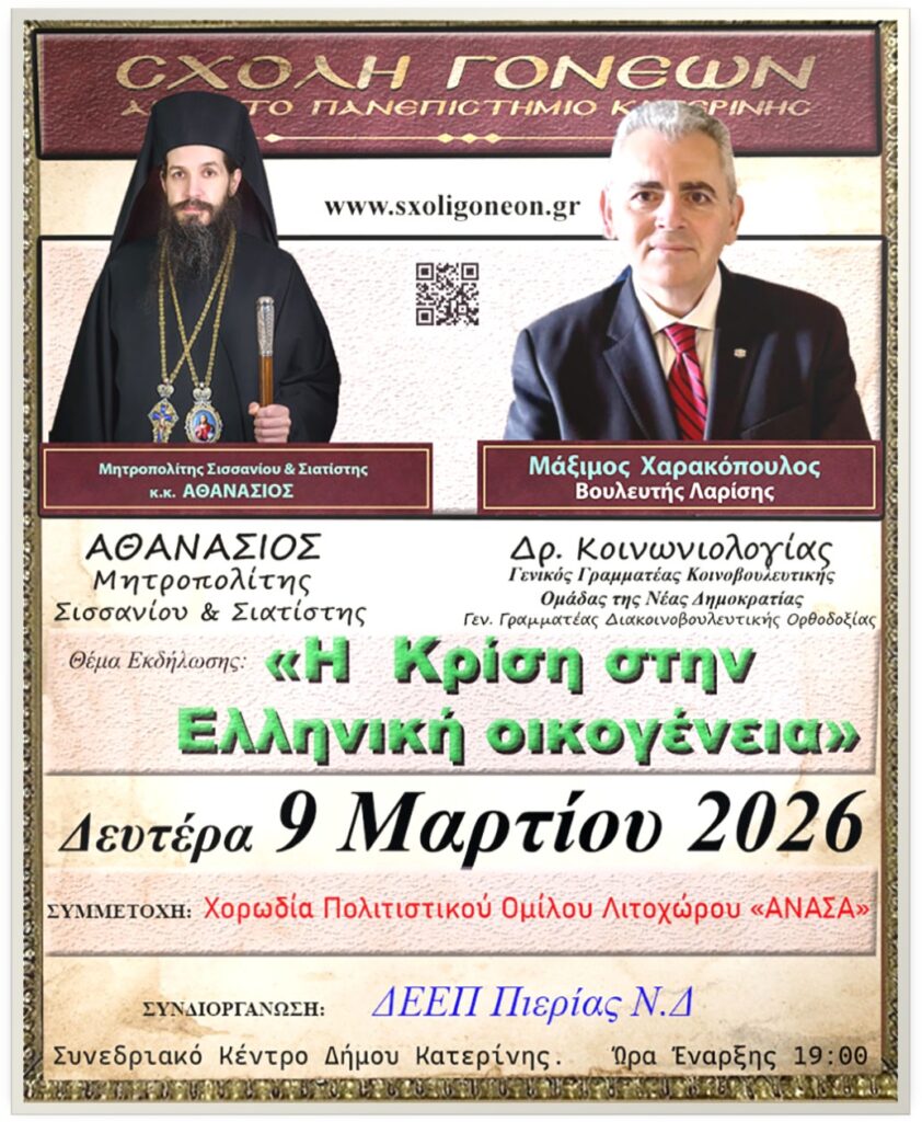 Η επόμενη εκδήλωση θα πραγματοποιηθεί την Δευτέρα 9 Μαρτίου 2026 με θέμα «Η κρίση στην Ελληνική Οικογένεια». Ομιλητές θα είναι ο σεβασμιώτατος Μητροπολίτης Σισσανίου & Σιατίστης π. Αθανάσιος και ο Βουλευτής Λαρίσης της Ν. Δ., Δρ. Κοινωνιολογίας, συγγραφέας και ιστορικός ερευνητής κ. Μάξιμος Χαρακόπουλος.