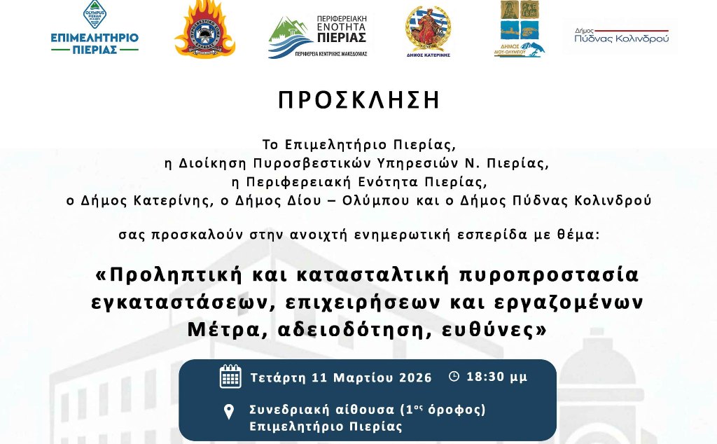 Η εσπερίδα με θέμα «Προληπτική και κατασταλτική πυροπροστασία εγκαταστάσεων, επιχειρήσεων και εργαζομένων – Μέτρα, αδειοδότηση, ευθύνες» θα πραγματοποιηθεί την Τετάρτη 11 Μαρτίου 2026 και ώρα 18:30 στη Συνεδριακή αίθουσα (1ος όροφος) του Επιμελητηρίου Πιερίας.