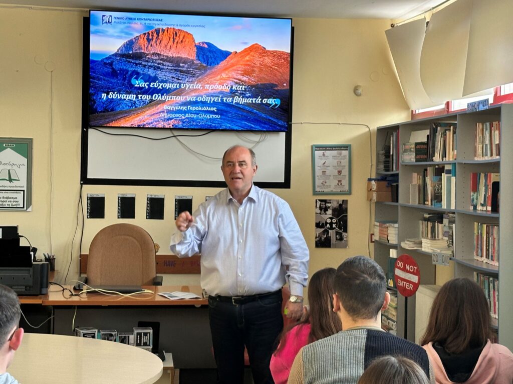 Προσκεκλημένος ομιλητής του Γενικού Λυκείου Κονταριώτισσας ήταν, το πρωί της Τετάρτης 4 Μαρτίου 2026, ο Δήμαρχος Δίου-Ολύμπου, Βαγγέλης Γερολιόλιος, στο πλαίσιο του εκπαιδευτικού προγράμματος «Μετά το σχολείο, τι; Η σχέση εκπαίδευσης & αγοράς εργασίας».