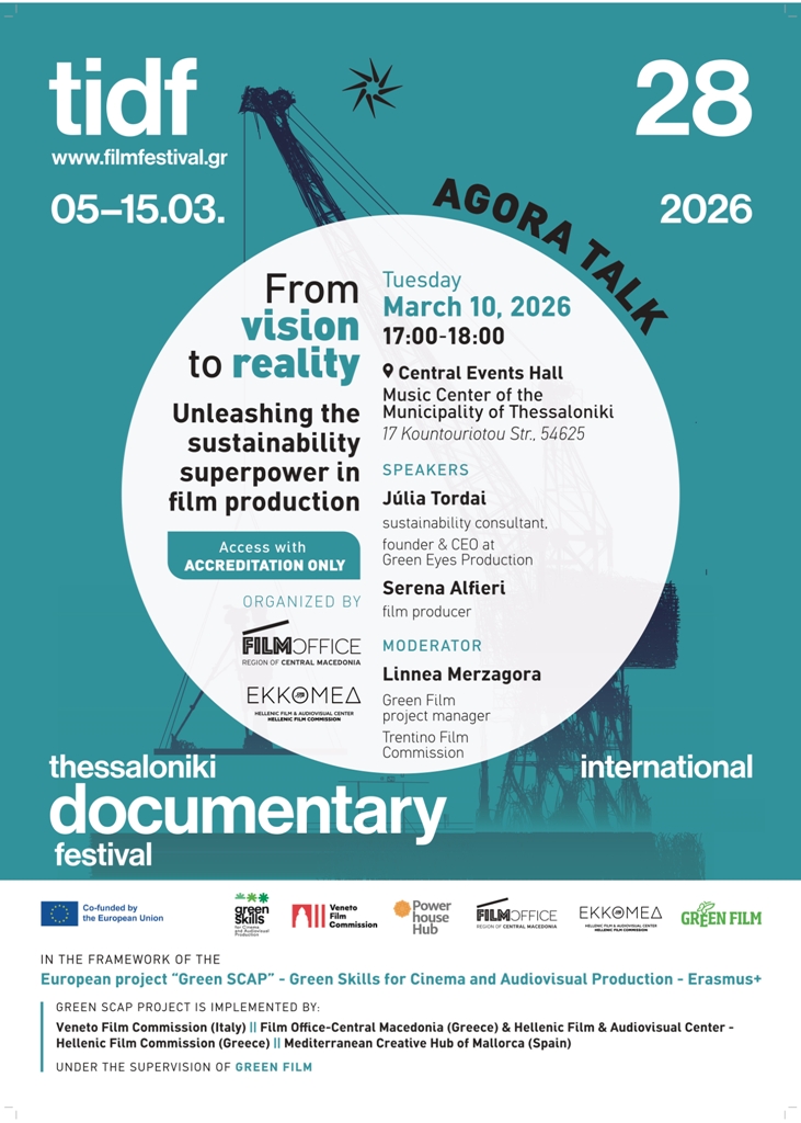 Με αφορμή το εργαστήριο, θα πραγματοποιηθεί ενημερωτική εκδήλωση στο πλαίσιο της ενότητας Agora Talks, με τίτλο: “From vision to reality: Unleashing the sustainability superpower in film production”. Η εκδήλωση θα διεξαχθεί την Τρίτη 10 Μαρτίου 2026 στο Κέντρο Μουσικής Δήμου Θεσσαλονίκης (Κουντουριώτου 17), στις 5 το απόγευμα, στο πλαίσιο της Αγοράς του 28ου Φεστιβάλ Ντοκιμαντέρ Θεσσαλονίκης. Θα πραγματοποιηθεί στα αγγλικά, θα ακολουθήσει συζήτηση και απευθύνεται αποκλειστικά σε διαπιστευμένους επαγγελματίες της Αγοράς.