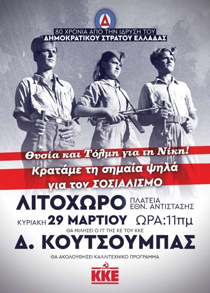 Ο ΓΓ της ΚΕ του ΚΚΕ, Δημήτρης Κουτσούμπας, θα μιλήσει την Κυριακή 29 Μαρτίου στις 11 π.μ., στην εκδήλωση με τίτλο «Θυσία και Τόλμη για τη νίκη! Κρατάμε τη σημαία ψηλά για τον σοσιαλισμό!», με αφορμή τη συμπλήρωση 80 χρόνων από την ίδρυση του Δημοκρατικού Στρατού Ελλάδας.