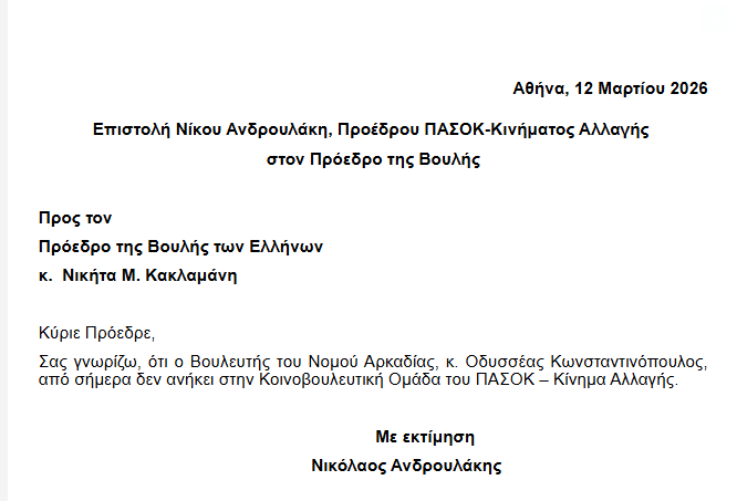 Στη διαγραφή από την ΚΟ του ΠΑΣΟΚ Οδυσσέα Κωνσταντινόπουλου προχώρησε ο Πρόεδρος του κόμματος Νίκος Ανδρουλάκης, όπως γνωστοποίησε με επιστολή του στον πρόεδρο της Βουλής.