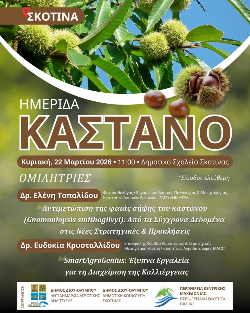 Η Αντιδημαρχία Αγροτικής Ανάπτυξης του Δήμου Δίου-Ολύμπου σας προσκαλεί στην ενημερωτική ημερίδα για τις παθήσεις και τη διαχείριση των καστανοκαλλιεργειών, την Κυριακή 22 Μαρτίου 2026 (ώρα 11:00) στην αίθουσα εκδηλώσεων του Δημοτικού Σχολείου Σκοτίνας.