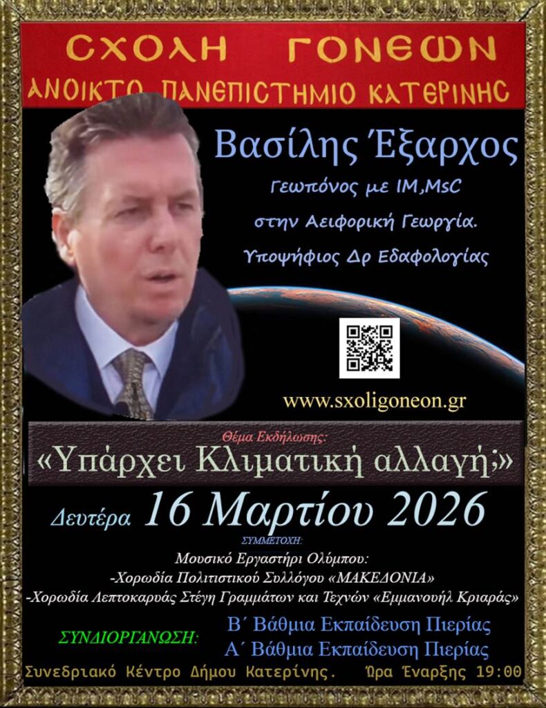 Η τρομοκρατία που ασκούν οι δήθεν «ειδικοί» για την κλιματική αλλαγή μέσω των «προβλέψεών» τους αποβλέπει στον έλεγχο μας; Αυτά και άλλα πολλά θα συζητηθούν και θα αναλυθούν με τους φίλους της Σχολή Γονέων – Ανοικτό Πανεπιστήμιο Κατερίνης την Δευτέρα 16 Μαρτίου 2026 στις 19:00 από τον Γεωπόνο κ. Βασίλειο Έξαρχο. Η εκδήλωση γίνεται σε Συνδιοργάνωση με την Πρωτοβάθμια και Δευτεροβάθμια Εκπαίδευση Πιερίας.