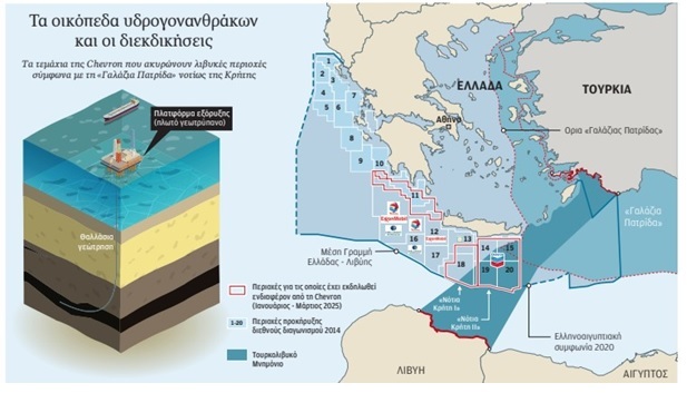 H υπογραφή των συμβάσεων ανάμεσα στο Ελληνικό Δημόσιο και την κοινοπραξία της ‘‘Chevron – Helleniq Energy’’ σχετικά με την προς εκμετάλλευση παραχώρηση στην αντισυμβαλλόμενη του ελληνικού κράτους τεσσάρων ‘‘θαλάσσιων οικοπέδων’’ (οικόπεδα ‘‘Νοτίως της Πελοποννήσου’’, ‘‘Α2’’, ‘‘Κρήτη 1’’ και ‘‘Κρήτη 2’’) ξεσήκωσε ‘‘θύελλα’’ στο εγχώριο πολιτικό σκηνικό, προφανώς διότι μια τροπολογία της ‘‘τελευταίας ώρας’’ στο κείμενο των συμβάσεων εκλήφθηκε από πολιτικές δυνάμεις και μέρος του δημοσιογραφικού κόσμου ως ευθέως σχετιζόμενη με μια πιθανή ‘‘απομείωση’’ των κυριαρχικών μας δικαιωμάτων, ειδικά στα δύο άνω ‘‘οικόπεδα’’ που αφορούν τη νοτίως της Κρήτης θαλάσσια περιοχή (ίδετε τον Χάρτη 1 στο τέλος του κειμένου).