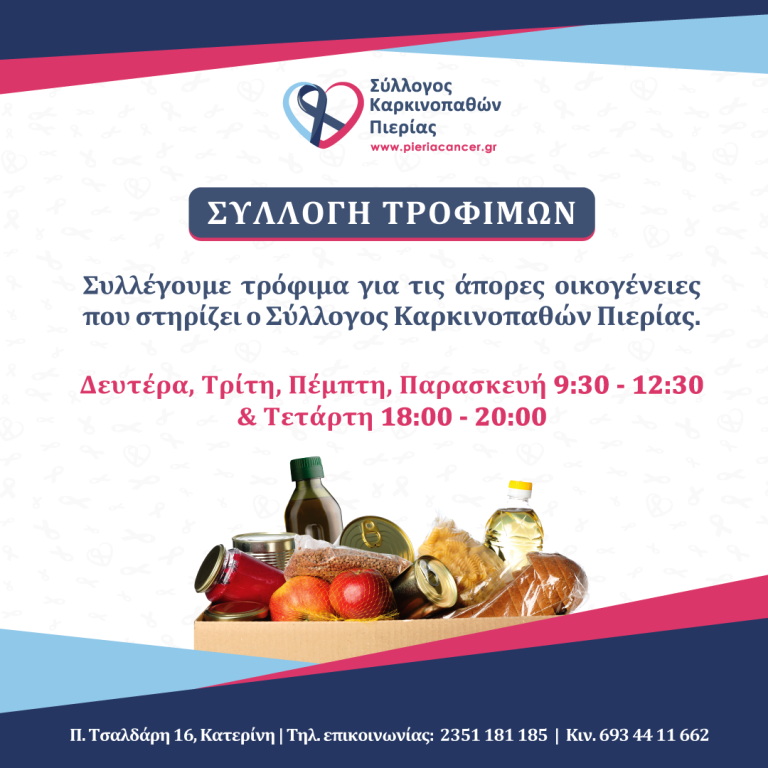 Ο Σύλλογος Καρκινοπαθών Πιερίας απευθύνει μια θερμή έκκληση αγάπης. Συγκεντρώνουμε τρόφιμα μακράς διαρκείας για να στηρίξουμε τις άπορες οικογένειες του Συλλόγου μας, ώστε φέτος το Πάσχα η αξιοπρέπεια και η ελπίδα να καθίσουν στο τραπέζι κάθε σπιτιού.