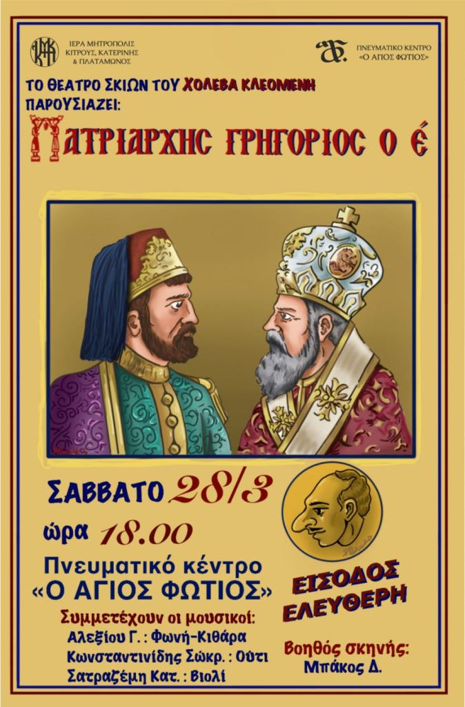 Η Ιερά Μητρόπολη Κίτρους, Κατερίνης και Πλαταμώνος, στο πλαίσιο των και πολιτιστικών της δράσεων για την Εθνική Επέτειο της 25ης Μαρτίου, παρουσιάζει τη παράσταση θεάτρου Σκιών «Πατριάρχης Γρηγόριος Ε΄».