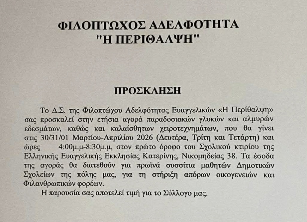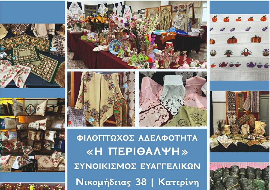 Η Φιλόπτωχος Αδελφότητα της Ελληνικής Ευαγγελικής Εκκλησίας Κατερίνης «Η Περίθαλψη», που φέτος συμπληρώνει 99 χρόνια αδιάλειπτης προσφοράς στον συνάνθρωπο, προσκαλεί το κοινό στην ετήσια φιλανθρωπική αγορά της.