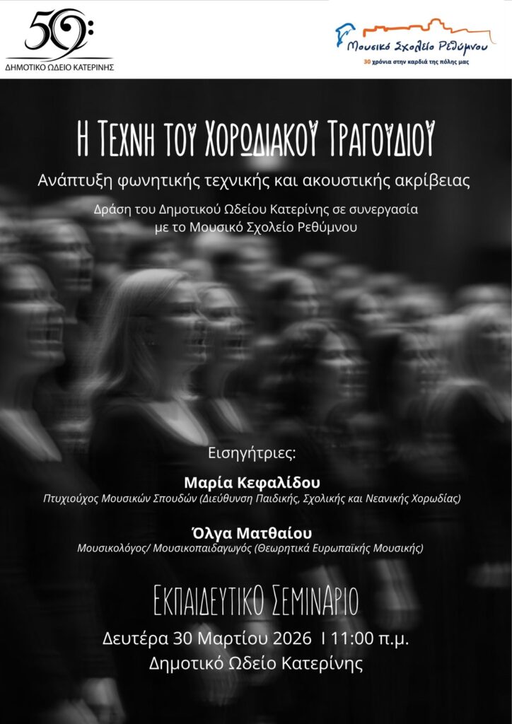 Τη Δευτέρα 30 Μαρτίου στις 11:00 π.μ. στο ΔΩΚ, οι μαθητές του Μουσικού Σχολείου Ρεθύμνου θα παρακολουθήσουν σεμινάριο χορωδιακού τραγουδιού στο Δημοτικό Ωδείο Κατερίνης.