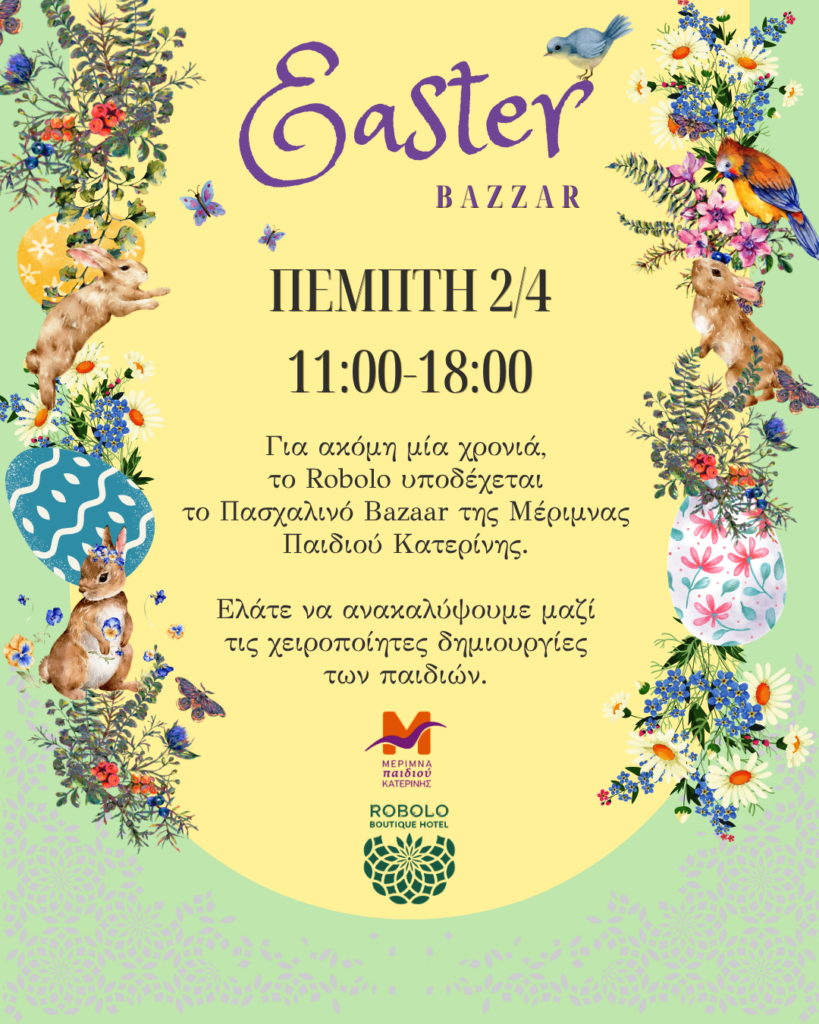 Με ιδιαίτερη χαρά σας προσκαλούμε στο Πασχαλινό Bazaar της Μέριμνας Παιδιού Κατερίνης, που θα φιλοξενηθεί στο Robolo Boutique Hotel by H&T.