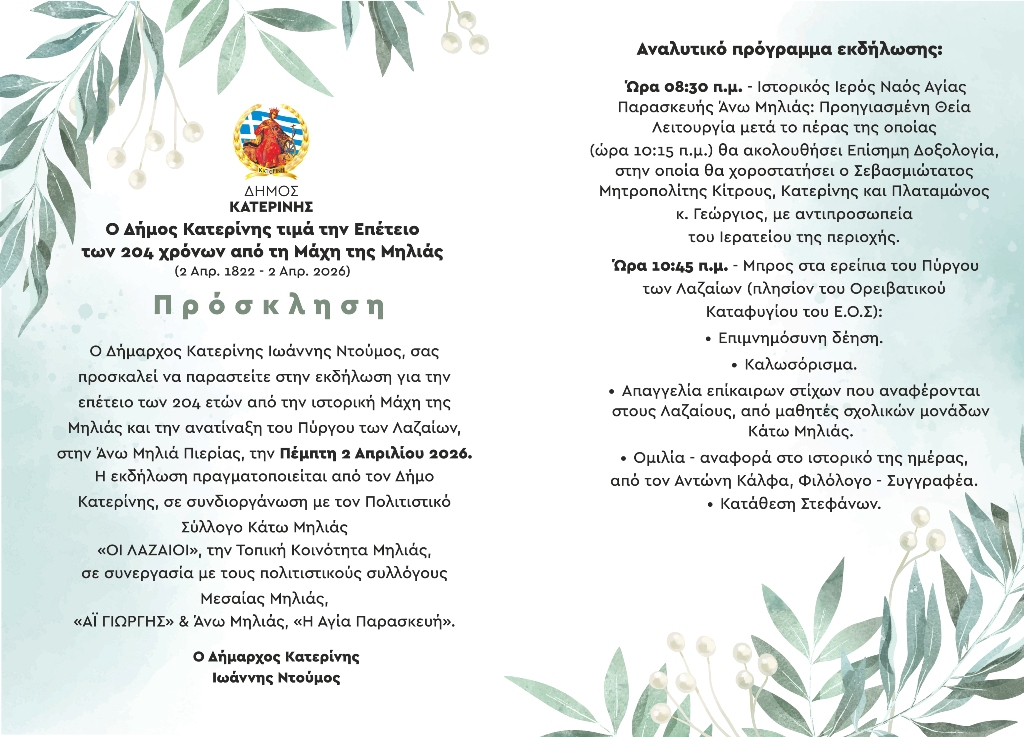 Ο Δήμος Κατερίνης τιμά την Επέτειο των 204 χρόνων από τη Μάχη της Μηλιάς (2 Απρ. 1822 – 2 Απρ. 2026) Κοινωνία 30 Μαρτίου 202630 Μαρτίου 2026Pieria Social ΠΡΟΓΡΑΜΜΑ ΑΝΑΛΥΤΙΚΟΛήψη