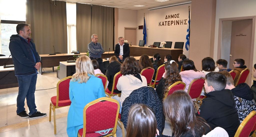 Μια ανοιχτή συζήτηση με παιδιά της ΣΤ’ Τάξης του 4ου Δημοτικού Σχολείου, είχε σήμερα ο Δήμαρχος Κατερίνης, Ιωάννης Ντούμος, παρουσία του Αντιδημάρχου, Μιχάλη Γεωργιάδη. Οι 20 μαθητές και μαθήτριες, που συνοδεύονταν από τον Διευθυντή του Σχολείου, Βασίλειο Μιχαλόπουλο, καθώς επίσης και από τη Δασκάλα, Άννη Καραναστάση, επισκέφθηκαν το Δημαρχείο προκειμένου να καταγράψουν στοιχεία που αφορούν την ιστορία, τη λειτουργία και τα προβλήματα του Δήμου.