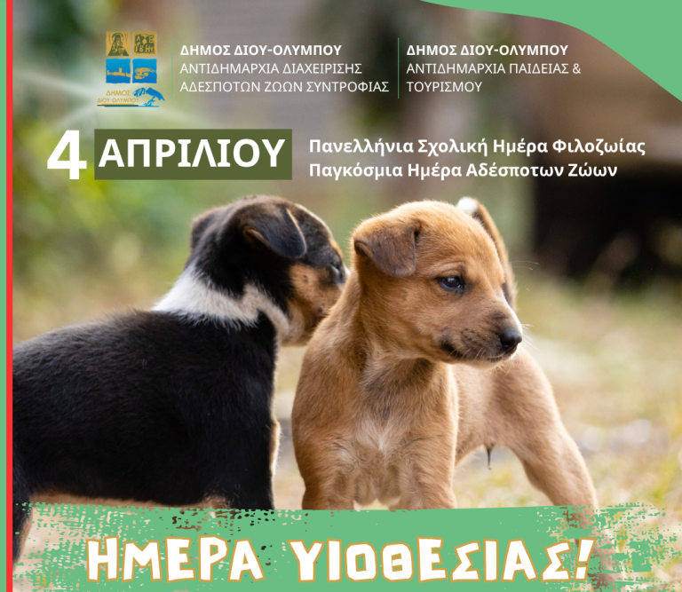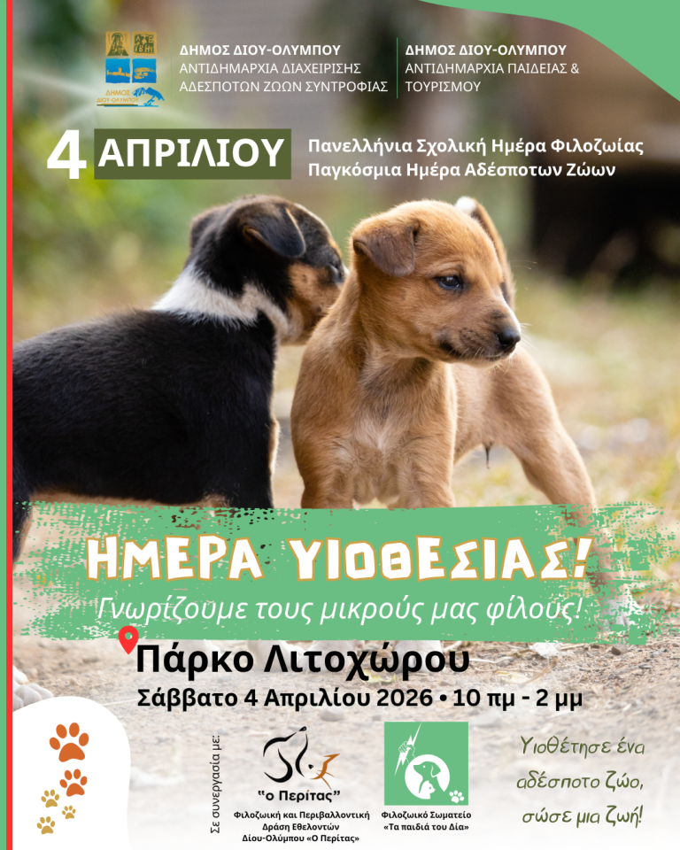 Ο Δήμος Δίου-Ολύμπου σας προσκαλεί στην «Ημέρα Υιοθεσίας Αδέσποτων» το Σάββατο 4 Απριλίου 2026 στο δημοτικό πάρκο Λιτοχώρου (ώρες: 10:00-14:00).