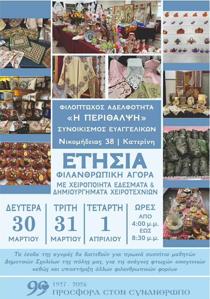 Με μια ζεστή αγκαλιά υποδέχθηκε χθες το κοινό της Κατερίνης την έναρξη της Ετήσιας Φιλανθρωπικής Αγοράς της Αδελφότητας «Η Περίθαλψη». Στον 1ο όροφο του Σχολικού κτιρίου (Νικομηδείας 38), η πρώτη μέρα της διοργάνωσης ολοκληρώθηκε με απόλυτη επιτυχία, επιβεβαιώνοντας για 99η συνεχή χρονιά τους ισχυρούς δεσμούς προσφοράς της Ελληνικής Ευαγγελικής Εκκλησίας με την τοπική κοινωνία.