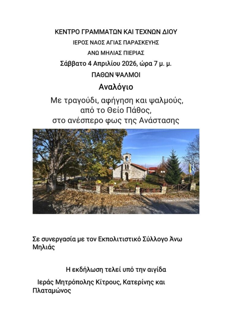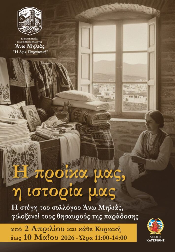 Ο εκπολιτιστικός – εξωραϊστικός σύλλογος Άνω Μηλιάς θέλοντας να τιμήσει τον αγώνα των κλεφταρματολών της περιοχής μας διοργανώνει από τις 2/4- 10/5 έκθεση στη στέγη του Συλλόγου μας στην Άνω Μηλιά με θέμα : Η ΠΡΟΙΚΑ ΜΑΣ Η ΙΣΤΟΡΙΑ ΜΑΣ