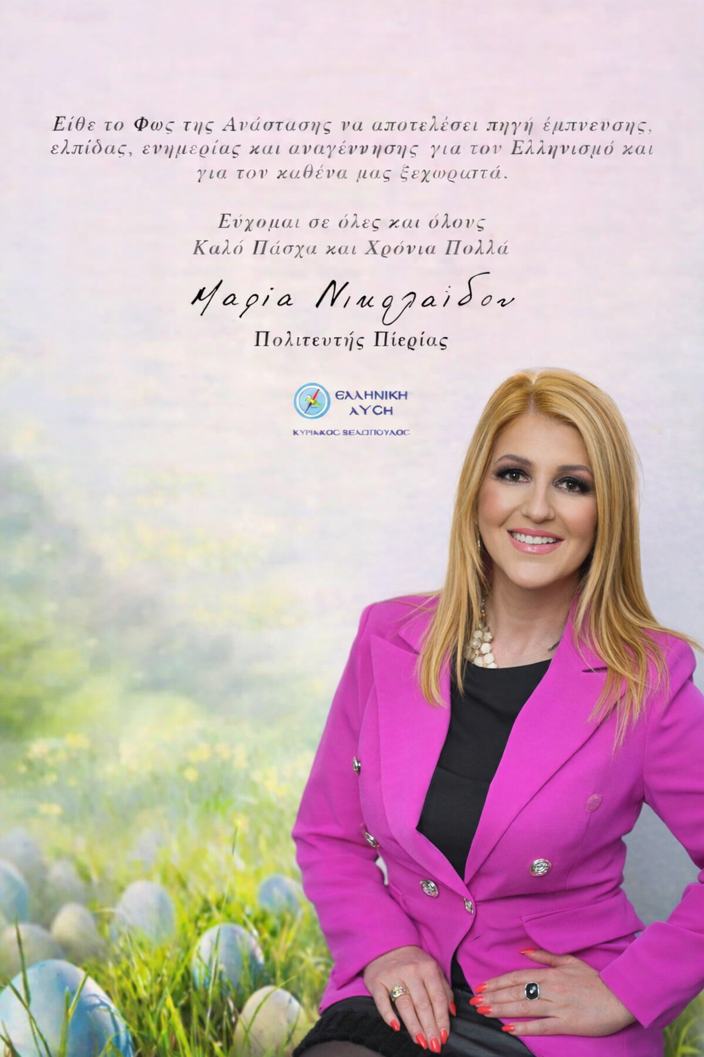 Σας επισυνάπτω το πασχαλινό μου μήνυμα προς τους συμπολίτες μας στην Πιερία, καθώς και μια συνοδευτική φωτογραφία, και θα ήταν ιδιαίτερη τιμή για εμένα αν μπορούσατε να το δημοσιεύσετε.