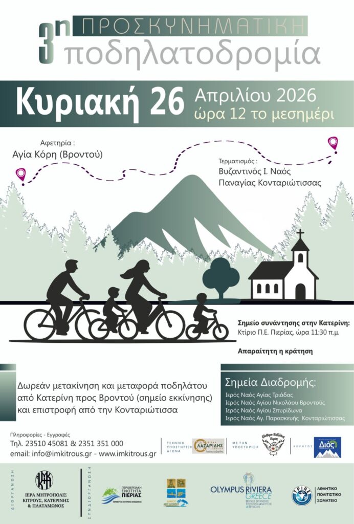 Την Κυριακή 26 Απριλίου 2026 και ώρα 12 το μεσημέρι θα πραγματοποιηθεί η «3η ΠΡΟΣΚΥΝΗΜΑΤΙΚΗ ΠΟΔΗΛΑΤΟΔΡΟΜΙΑ» που διοργανώνει η Ιερά μας Μητρόπολη με την Π.Ε. Πιερίας, τον Δήμο Δίου-Ολύμπου, τον Π.Ο.Τ.Α.Π. και τον Α.Π.Σ. ”ΤΡΙΑΣ” .Με την υποστήριξη της ομάδας ”Ελεύθεροι Ποδηλάτες Πιερίας”.