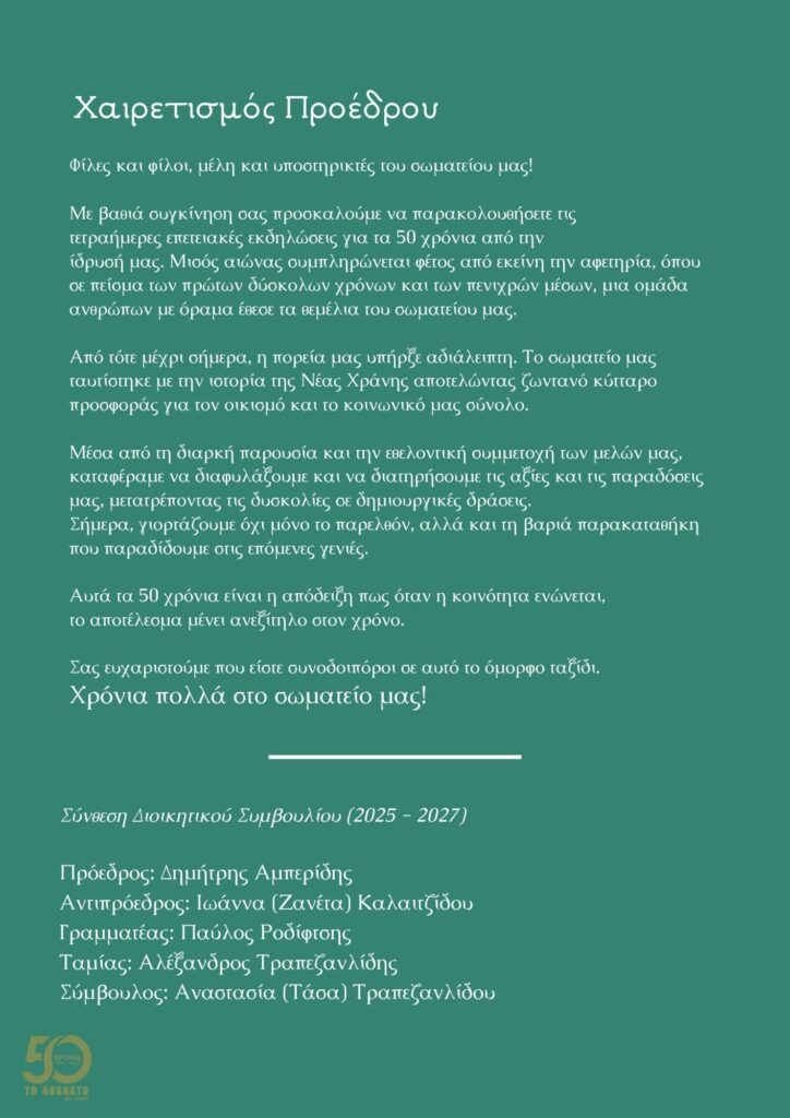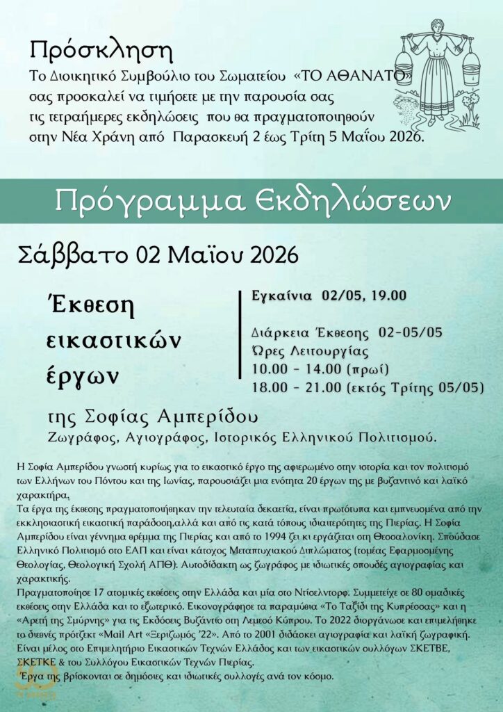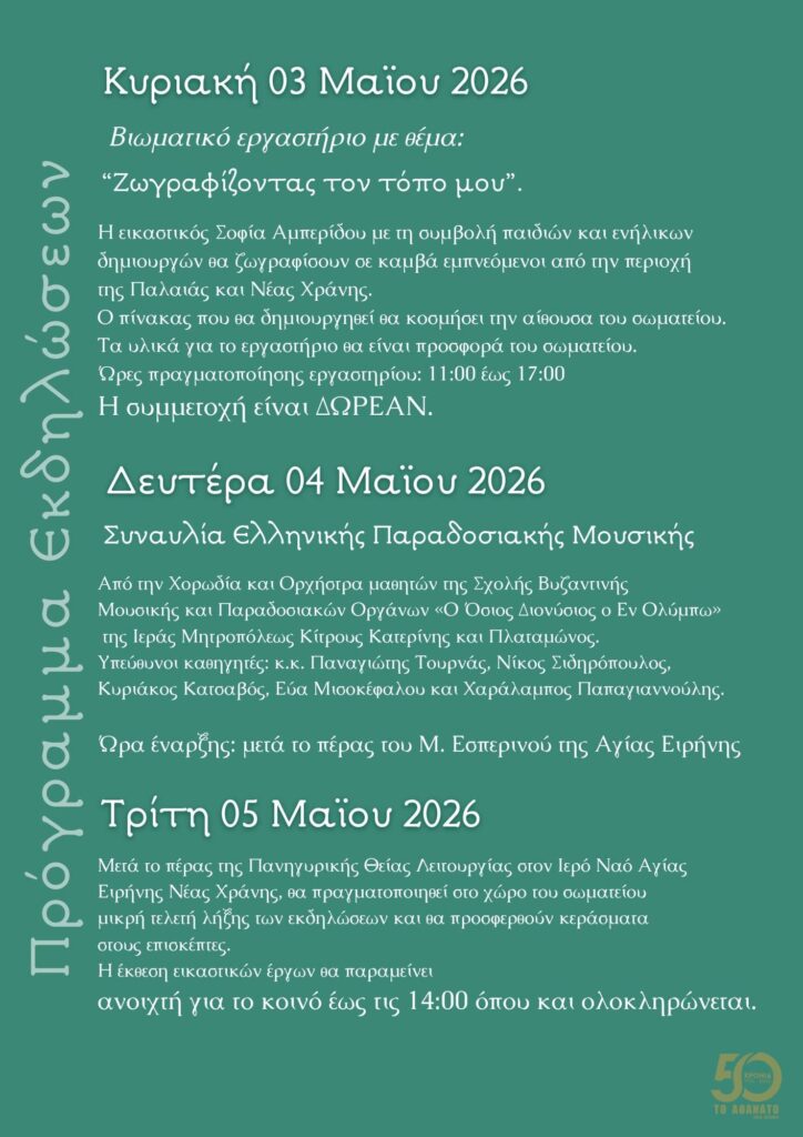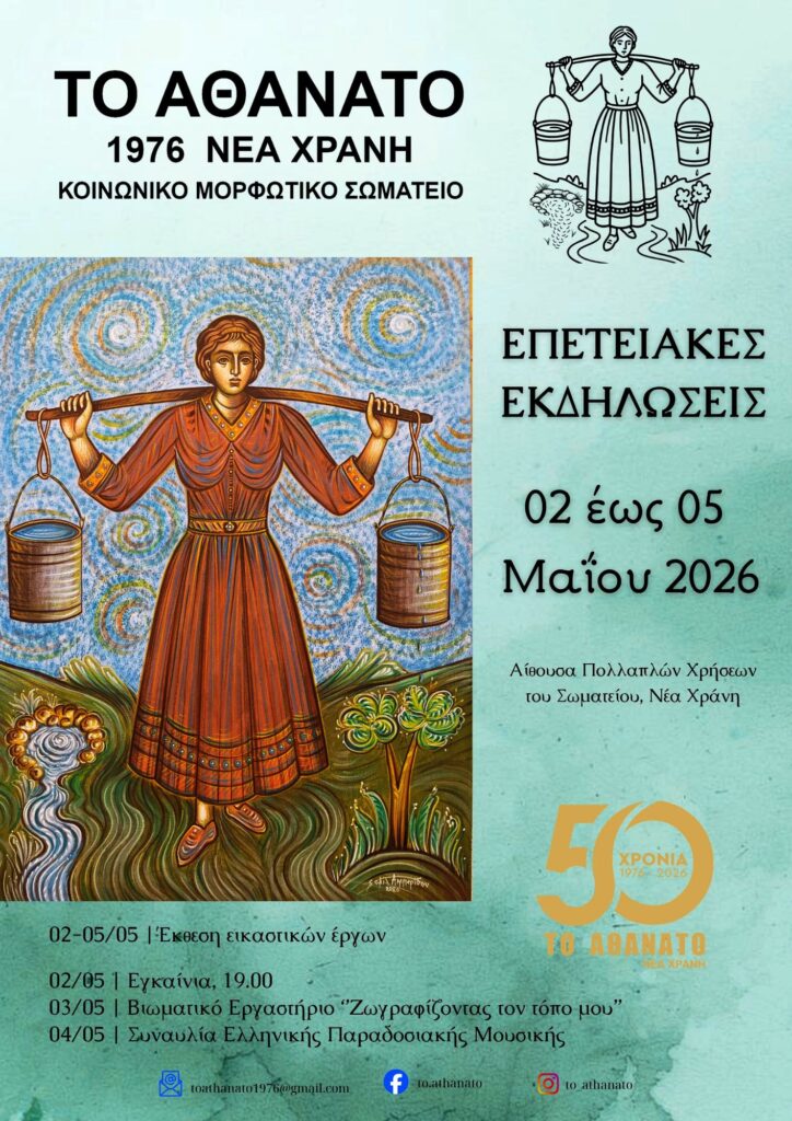 Το Κοινωνικό Μορφωτικό Σωματείο “ΤΟ ΑΘΑΝΑΤΟ”, τιμώντας τα 50 χρόνια από την ίδρυσή του, διοργανώνει ένα εορταστικό τετραήμερο επετειακών εκδηλώσεων.