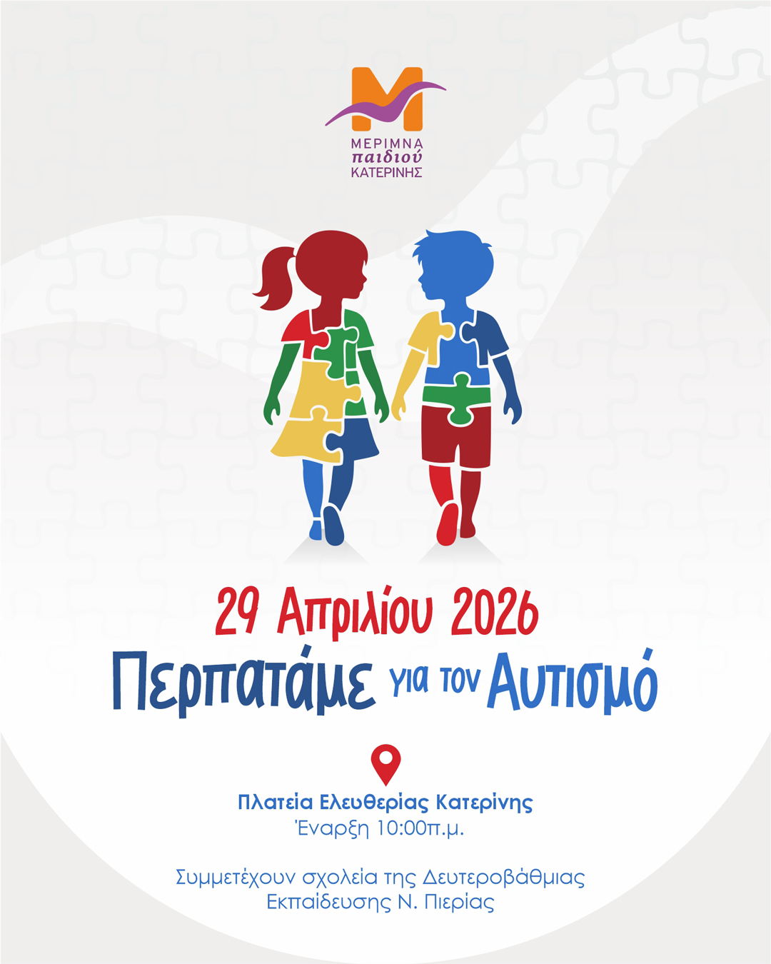 Στο πλαίσιο της Παγκόσμιας Ημέρας Ευαισθητοποίησης για τον Αυτισμό (02.04) διοργανώνουμε την εκδήλωση «Περπατώ για τον Αυτισμό» στην κεντρική πλατεία της πόλης μας την Τετάρτη 29 Απριλίου 2026. Η πρωτοβουλία αυτή στοχεύει στην καλλιέργεια σεβασμού απέναντι στην διαφορετικότητα και την ενίσχυση της κοινωνικής ευαισθησίας απέναντι στα άτομα με αυτισμό.