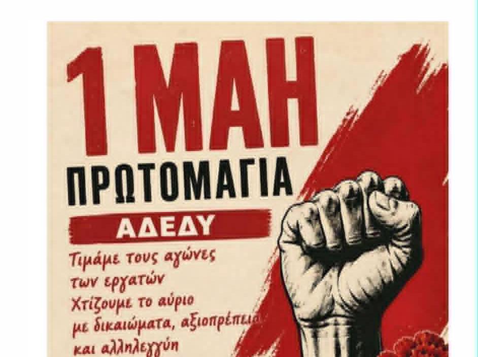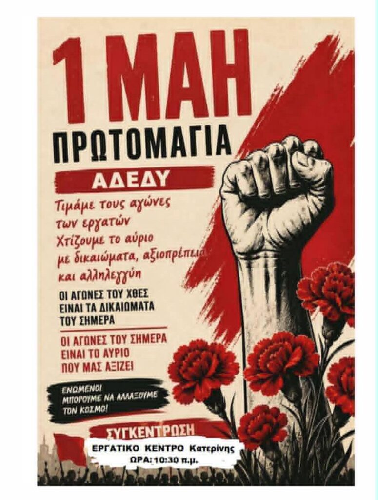 Όλοι και όλες στην απεργιακή συγκέντρωση στο ΕΡΓΑΤΙΚΟ ΚΕΝΤΡΟ Κατερίνης την Παρασκευή 1η Μάη 2026 στις 10:30 το πρωί