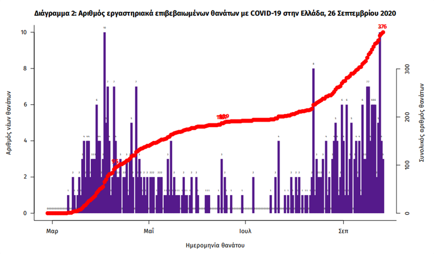 Τέλος, έχουμε 7 ακόμα καταγεγραμμένους θανάτους και 376 θανάτους συνολικά στη χώρα. 140 (37.2%) γυναίκες και οι υπόλοιποι άνδρες. Η διάμεση ηλικία των θανόντων συμπολιτών μας ήταν τα 78 έτη και το 96.8% είχε κάποιο υποκείμενο νόσημα ή/και ηλικία 70 ετών και άνω.