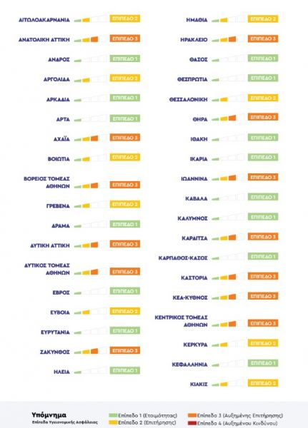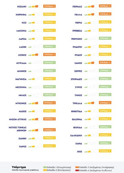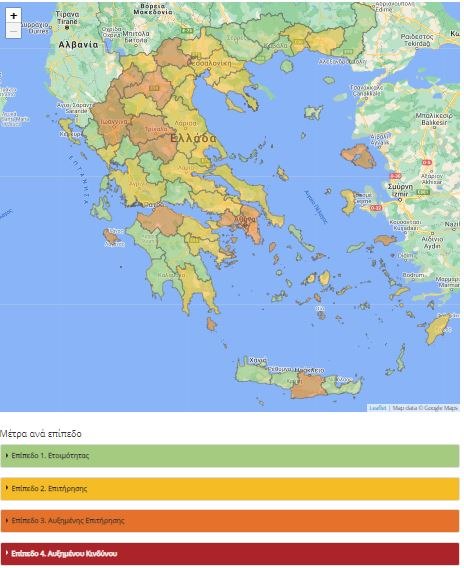 Ο χάρτης περιλαμβάνει τέσσερα επίπεδα προληπτικών μέτρων και κανόνων για κάθε περιφερειακή ενότητα της χώρας (Επίπεδο 1 – Ετοιμότητας, Επίπεδο 2 – Επιτήρησης, Επίπεδο 3 – Αυξημένης Επιτήρησης και Επίπεδο 4 – Αυξημένου Κινδύνου).